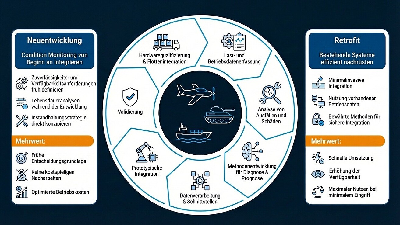 Die Nachrüstung von Zustandsüberwachungssystemen in bestehenden Anlagen oder Fahrzeugen stellt besondere Anforderungen. Technische Lösungen müssen sich in vorhandene Strukturen integrieren, ohne den laufenden Betrieb zu beeinträchtigen oder bestehende Zulassungen zu gefährden. Gleichzeitig gilt es, vorhandene Datenquellen sinnvoll einzubinden und nutzbar zu machen.